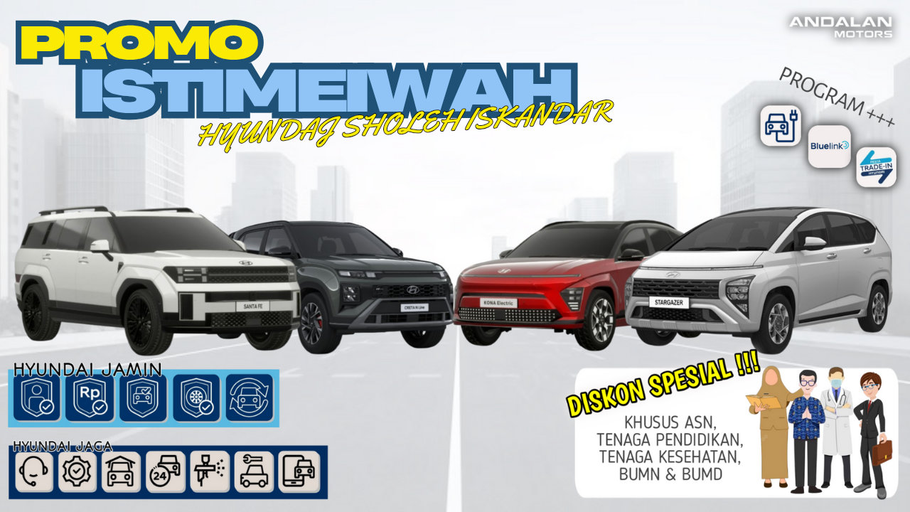 Dealer Resmi Hyundai Sholeh Iskandar, PT. Andalan Auto Prima, Melayani Pembelian Cash, Credit & Tradein. Siap mewujudkan mobil impian anda dibantu dengan Sales Consultant terpercaya. Menawarkan berbagai varian mobil Hyundai baik kategori LMPV, LSUV, Crossover , Big Van dan Premium SUV. Hanya di Hyundai Bogor - Sholeh IskandarΒ Β bisa mendapat Promo Akhir Tahun & Pelayanan Terbaik. Tersedia unit : Hyundai Ioniq 5, Hyundai Stargazer, Hyundai Creta, Hyundai Staria, Hyundai Palisade, Hyundai Santa Fe, Hyundai Kona. Melayani Area Wilayah Jabodetabek dengan adanya Hyundai Bogor, Hyundai Depok, Hyundai Tangerang, Hyundai Jakarta,Β Hyundai Bekasi, Hyundai Sukabumi, Hyundai Bandung & Sekitarnya. Kenapa Harus Pembelian di Dealer Hyundai Bogor - Hyundai Sholeh Iskandar :